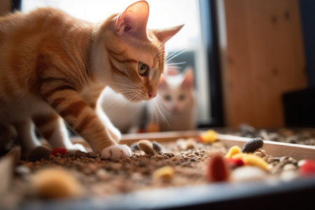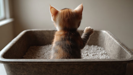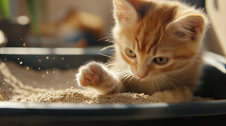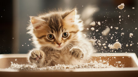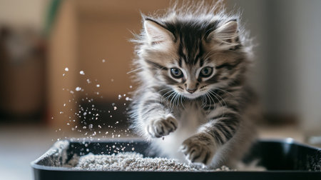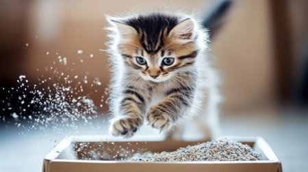 An adorable image of a kitten playfully kicking litter out of the box, with its fur flying and a playful expression, highlighting the energetic spirit of young cats.