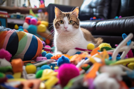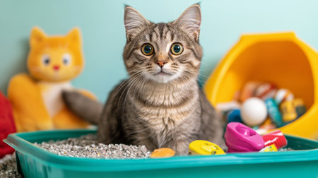 A playful cat sits in a vibrant litter box surrounded by toys, embodying curiosity and joy. Perfect for pet care themes and cat lovers.