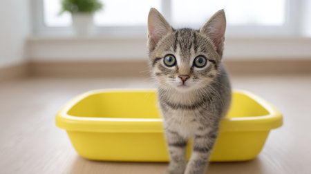 A charming playful kitten investigates a bright yellow litter box in a sunny room. This adorable scene captures the essence of feline curiosity and playfulness.