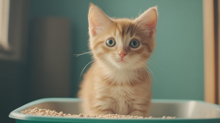 A cute ginger kitten is perched in a litter box, gazing with big blue eyes. The soft lighting enhances its fluffy fur, adding warmth and charm to the cozy indoor scene.