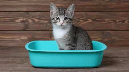 A charming grey tabby cat is comfortably sitting in a neutral litter box against a soft wooden background. The serene expression captures playful curiosity and warmth.