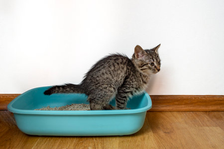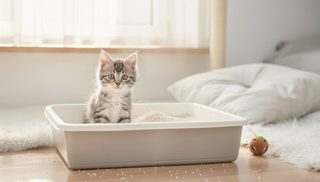 Cute gray kitten sitting in litter box in cozy indoor setting during afternoon sunlight