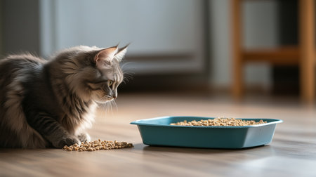 Cat observes food scattered on the floor near a bowl in a cozy indoor environment during daylight hours