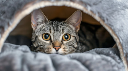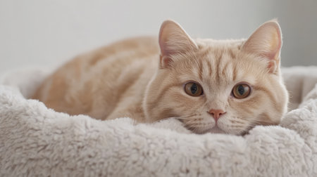 A fluffy English shorthair cat lies comfortably in a soft nest, enjoying a peaceful afternoon indoors, exuding a sense of tranquility and contentment.