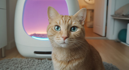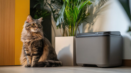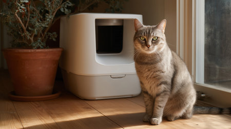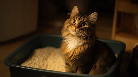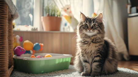 A cozy image of a fluffy cat sitting contently beside a clean litter box, surrounded by pet toys, creating a warm and inviting atmosphere in a loving home.