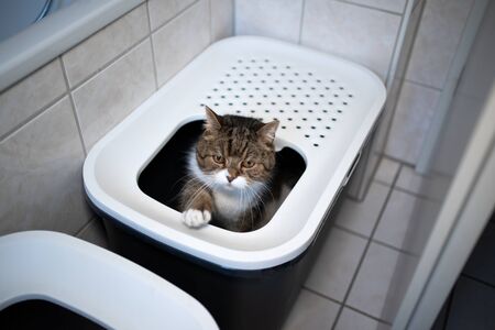 tabby white british shorthair cat leaving top entry cat litter box in the bathroom