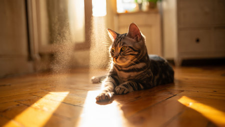 Serene Tabby Cat Basking in a Warm Stream of Golden Sunlight on a Polished Wooden Floor Evoking Feelings of Comfort Relaxation and Tranquil Domestic Bliss.