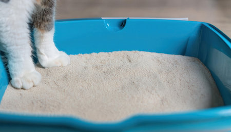 Close-up of a cat paw stepping into an open litter box filled with fine, sandy litter.