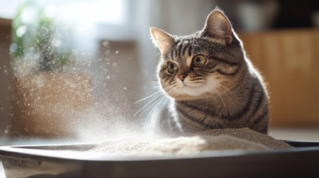 A playful scene of a cat burying its waste in a litter box, with sand flying and a look of determination, illustrating typical feline behavior.