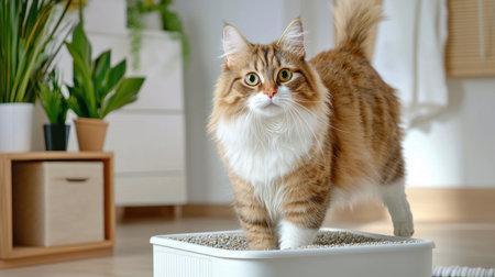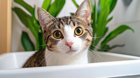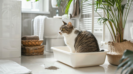 A curious domestic cat explores its litter box in a bright indoor setting, showcasing feline behavior, cleanliness, and a cozy home environment filled with greenery.