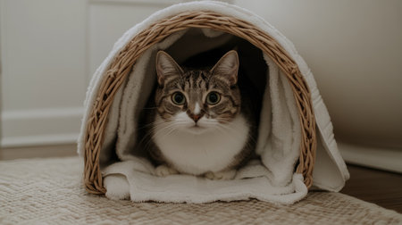 A cozy bathroom setting with a cat lounging in a towel after a bath, highlighting the comfort and care that pets receive post-grooming.