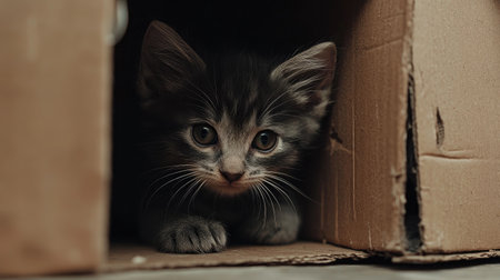 A kitten peeking out from a cardboard box, with its curious eyes and tiny paws visible, showcasing its playful and endearing nature.