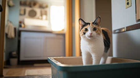A cute calico cat stands in a litter box, gazing curiously into the room. The bright background enhances the cozy atmosphere of this domestic scene.