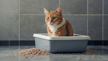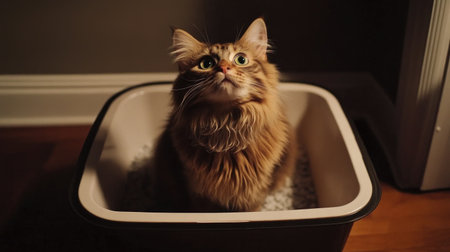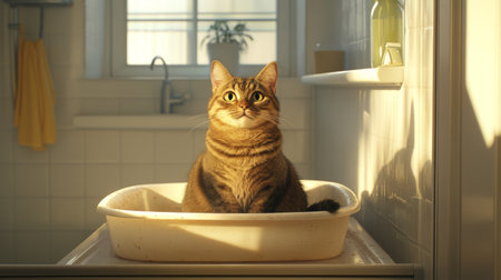 A cute cat sits in a litter box in a cozy bathroom setting, showcasing the daily routine and personal space of a domestic pet in a relaxed atmosphere.