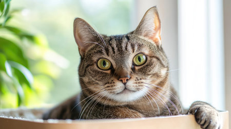 A curious domestic cat sits in a cozy indoor environment, with green plants adding a touch of nature. The expressive eyes and friendly demeanor showcase the cat's playful personality and beauty.