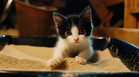 Playful kitten stepping into a litter box, paw sinking into the sand, curious expression, warm lighting