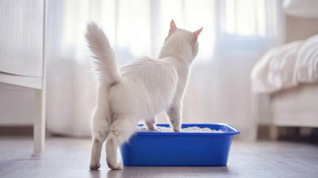 A cute white cat stands in a blue litter box, highlighting pet hygiene in a bright, cozy room with sunlight filtering through the window.