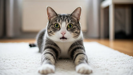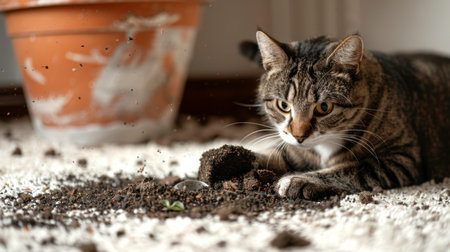 Curious cat amidst scattered potting soil from a plant pot on the white carpet. A funny kitten creating a mess. Concept of a mischievous pet, domestic animal, and home mess.