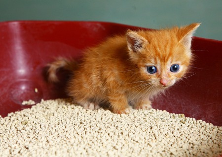 The concept of ingingusing a cat to the tray. The little red kitten sits in the toilet tray and looks straight