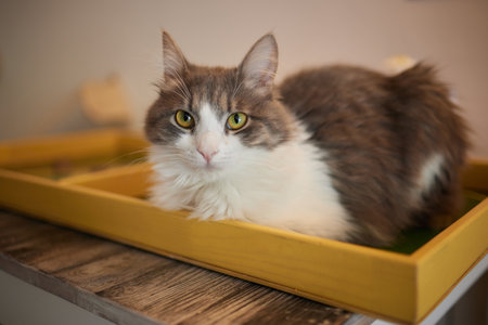 Fluffy calico cat sitting inside a clean litter box, looking up with alert eyes, soft, natural lighting