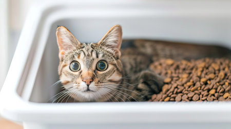 Curious Cat Peeking Out of Storage Bin Filled with Pet Food. Concept of Feline Curiosity, Playful Pets, and Animal Exploration.