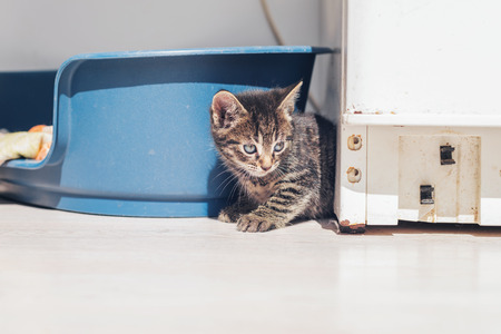 Little cute gray fluffy kitten hid in a blue cat tray and looks at the camera