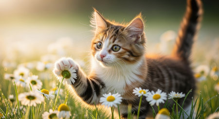 A kitten reaches for a daisy in a field with bright green grass and blooming wildflowers. The scene is bathed in warm sunlight, creating a soft focus. This image could be used for advertising, editorial content, or design projects, evoking feelings of nature and playfulness.