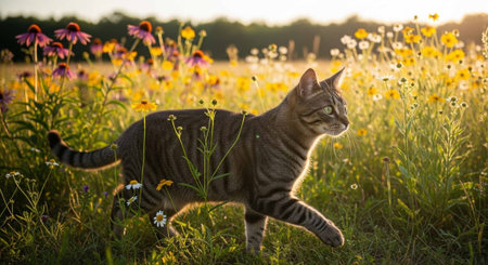 A curious tabby cat sits gracefully in a lush meadow, illuminated by the warm glow of sunset.
