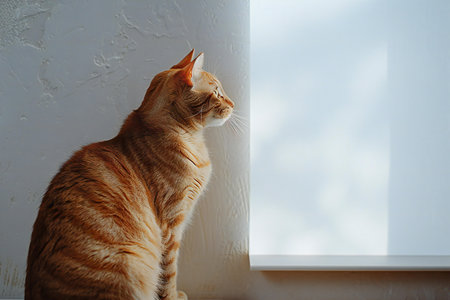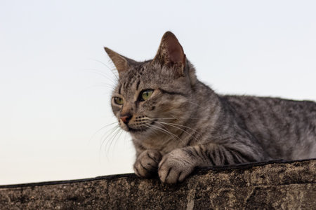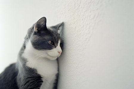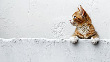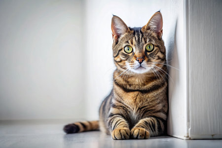 Cute Tabby Cat Leaning Against a White Wall - Cozy Pet Stock Photo