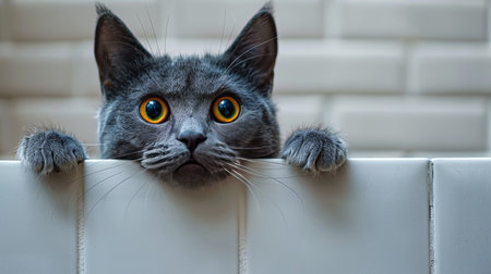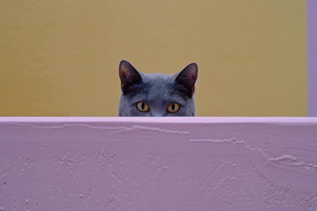 AI Generated. The cat peeks out from behind the blue wall, copy space
