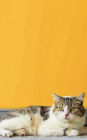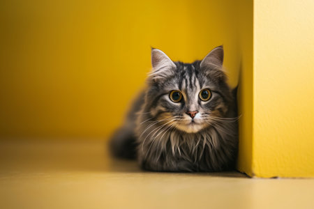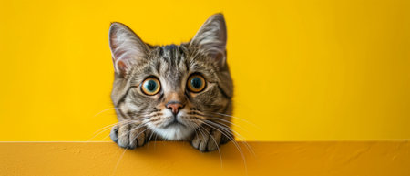 Startled Cat On Yellow Backdrop With Wide Eyes A Delightful Sight. Concept Expressive Animal Portraits, Vibrant Backdrops, Captivating Cat Photography, Surprise And Delight, Eye-Catching Pet Portraits.