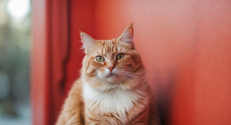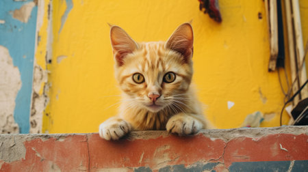AI Generated. A cute ginger cat character peeking out from behind a pink wall