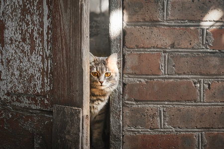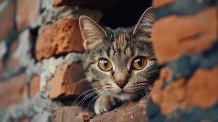 A striking black cat peers out from a textured brick wall in this image. Its intense orange eyes contrast vividly with its dark fur. The composition is close-up, focusing on the cat's face and the surrounding wall's details. The lighting suggests an outdoor environment, suitable for various editorial and commercial applications.