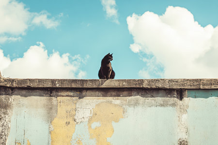 A black cat sits calmly on a concrete wall gazing into the distance as fluffy clouds drift by in a vibrant blue sky.