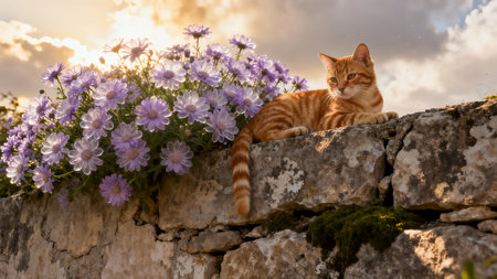 Ginger cat sitting on a stone wall with flowers at sunset.