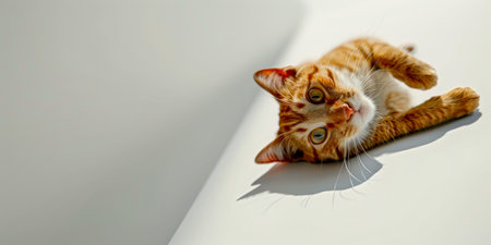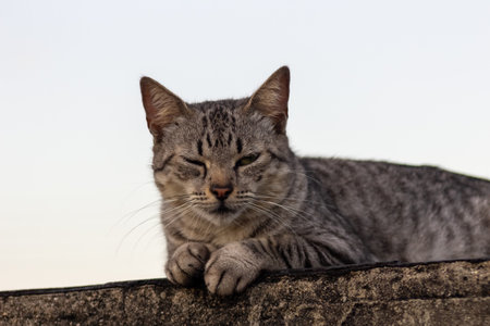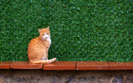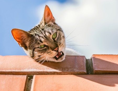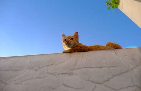 Cute yellow cat lying on the wall outside of house with emotion face and looking forward under blue sky, lovely pet have fun at morning