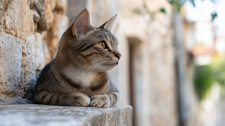 A curious tabby cat resting on a stone wall in a sunny European village, observing its surroundings with keen interest
