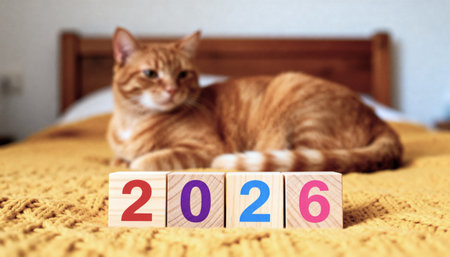 A cute orange tabby cat lies on a yellow bedspread. In front of it are wooden blocks with colorful numbers spelling out the year 2026. New Year concept.