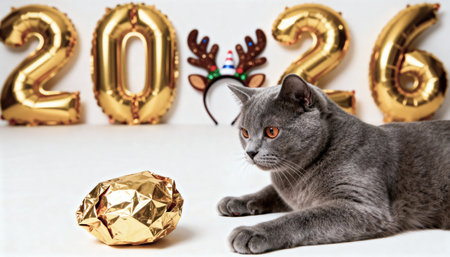 A charming grey cat with orange eyes lies in front of golden foil balloons spelling out 2026, celebrating the upcoming new year against a white background.