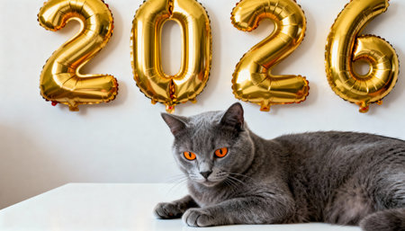 A beautiful gray cat with striking orange eyes lies on a white surface in front of golden balloons spelling out 2026, symbolizing a festive holiday celebration.
