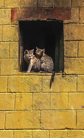 Two kittens on a window ledge of a building in the old town of Yuanyang county, Yunnan Province, China