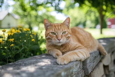 A relaxed orange tabby cat lounges atop a stone wall, basking in the warm sun while colorful flowers bloom nearby in the lush park setting.