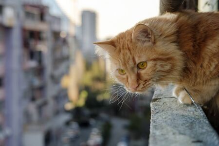 Red cat sitting on the balcony and looking around, blurred buildings background