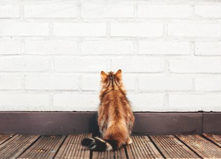 A kitten looking up on the wall. Siberian cat, conceptual image