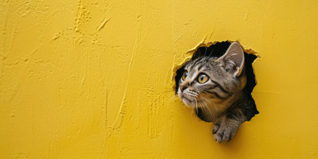 Close up view picture of the hollow yellow hole on the the wall that show the cat stay inside the wall that has been made from some material yet still can be break to look through other side. AIGX03.