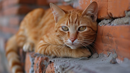 A ginger cat with curious eyes lounges by a brick wall, expressing curiosity, relaxation, and a homely atmosphere, space for text.