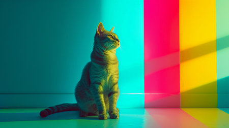 Cat sitting in front of rainbow colored wall with bright light behind, creating a magical and colorful scene