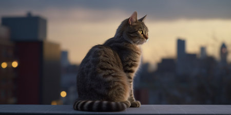 An AI generated illustration of a cat on a windowsill overlooking a nightscape
