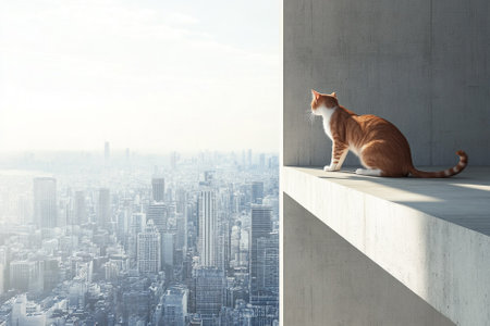 Red cat sitting on concrete wall and looking at the city. 3D Rendering