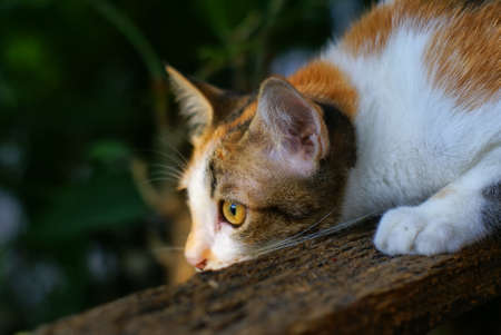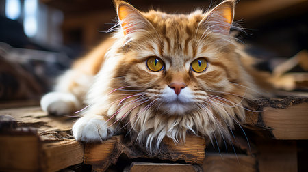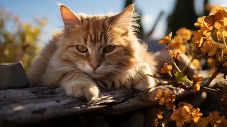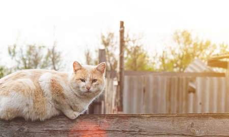 beautiful red cat lays on wood summer